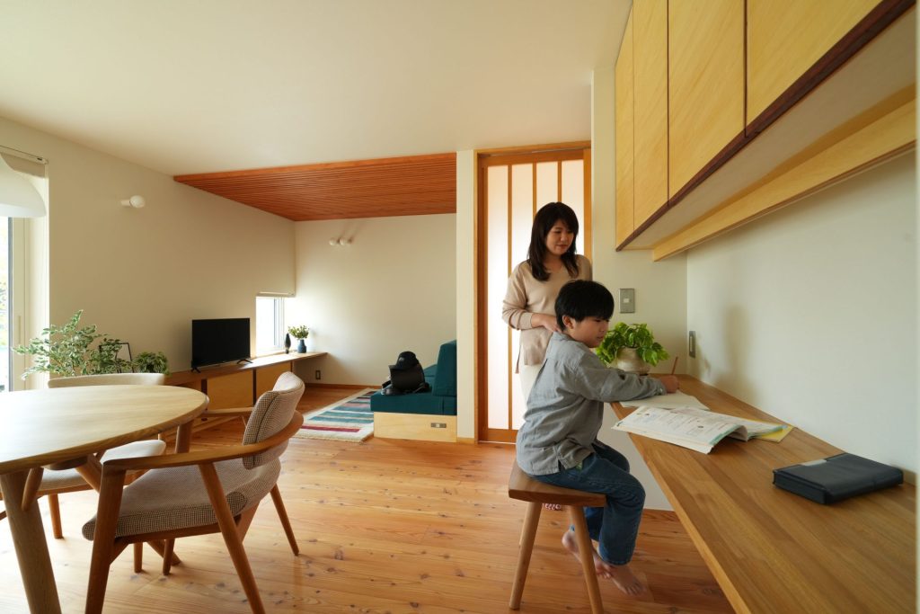 家族で使えるスタディコーナーを備えたLDK。くつろぐ場所と家事動線・収納が計画的に配置された暮らしやすい空間です。