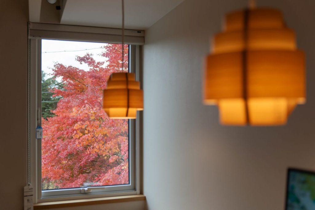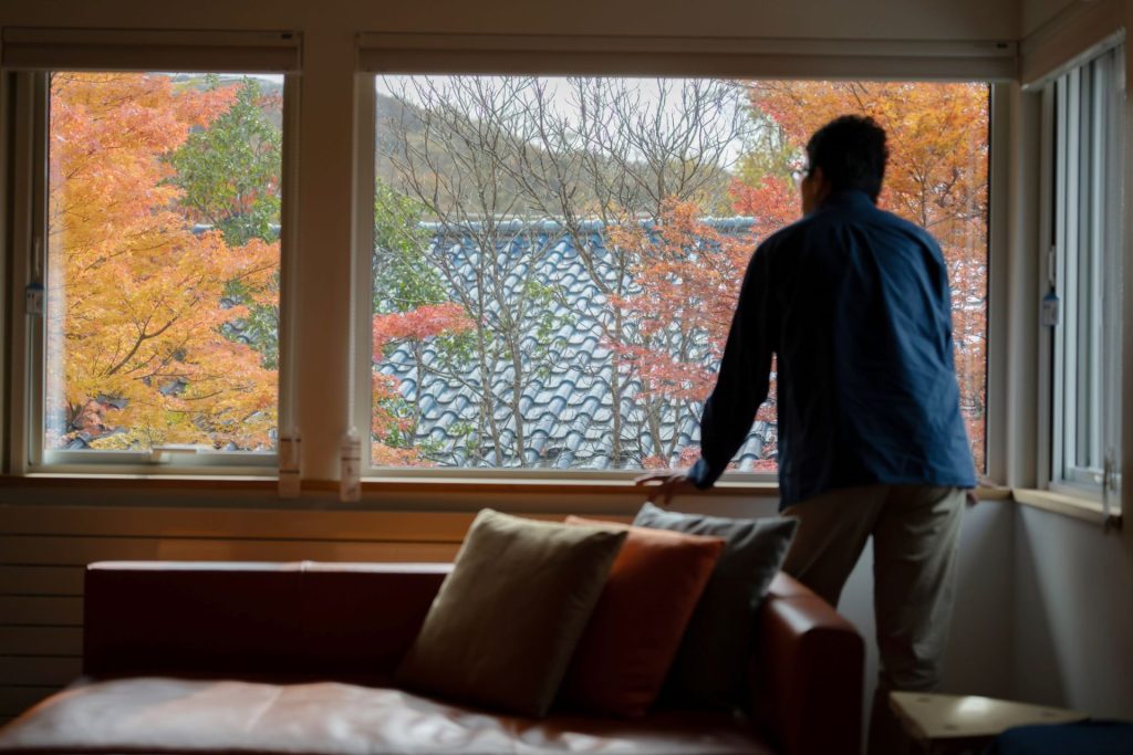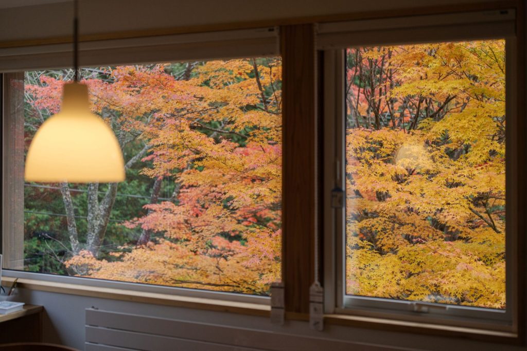 振り返った窓には、色づいた木々の鮮やかな錦模様。