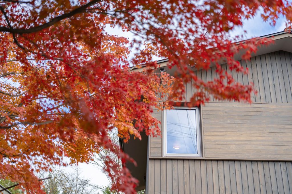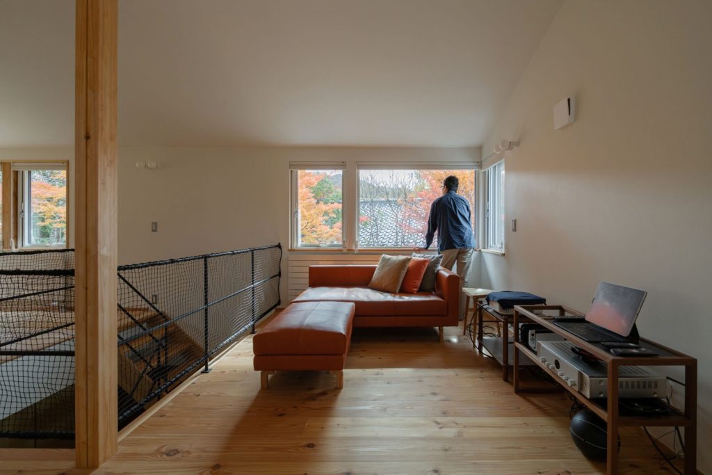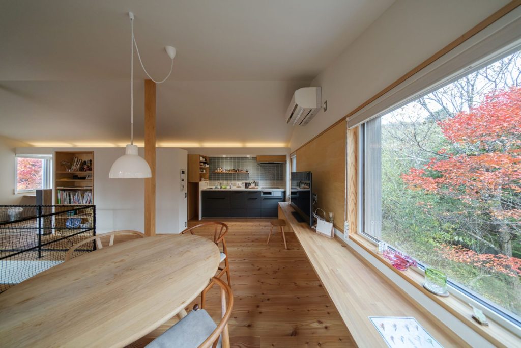 「個室と水まわりは一階、生活の中心となるLDKを二階にすることで、二階は間仕切り壁の少ないオープンな空間がつくれます。『モミジの家』は各階の面積が13.5坪ですが、切妻屋根のカタチを生かした斜天井と、視線を外へ導く窓の配置で、実際の数字よりも広く感じられるよう計画しました」と設計スタッフ。その言葉どおり、玄関ホールから吹き抜けの階段を上がっていくと、二階は建物の端から端まで見渡せるワンルームになっています。壁の三方に開いた窓は今が盛りの紅葉を額縁のように切り取って、まさに絶景。
