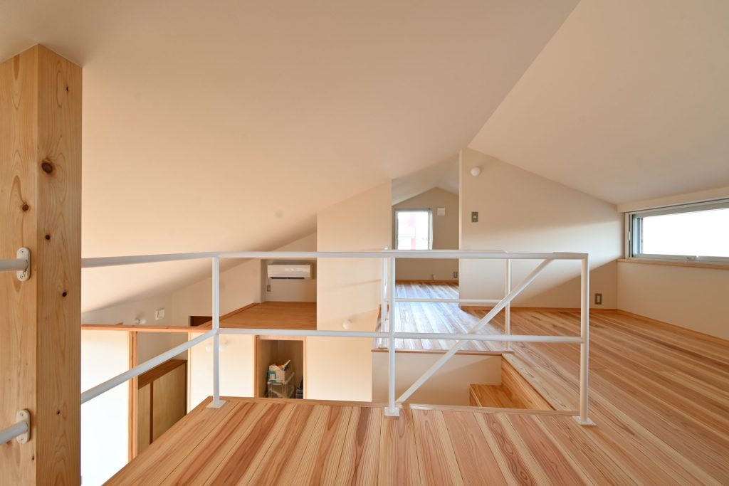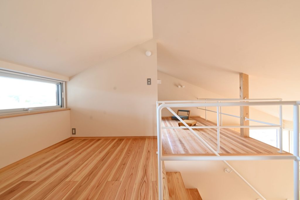 年を重ねても生活しやすいように、寝室も含めたメインの居場所は一階で完結。ロフトにはお子さんの個室や、吹き抜けに面したセカンドリビングを設けた。