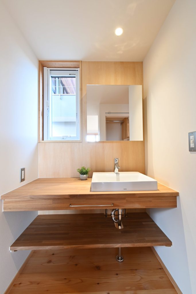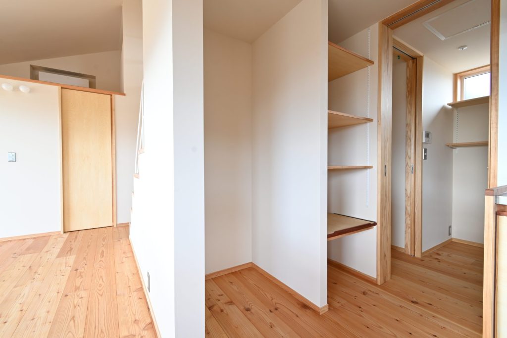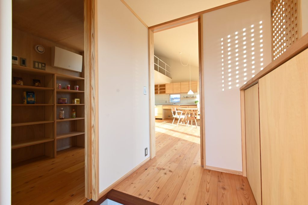 「モノの片付けに追われない暮らしがしたい」という要望から、家事動線や収納のボリュームをていねいに設計。季節の道具や上着類、日用品のストックは玄関脇の大型パントリー(3.0帖)に集約させたり、リビング階段を中心に、キッチン→水まわり→衣類収納がつながる回遊動線とするなど、家事の省力化を重視した。