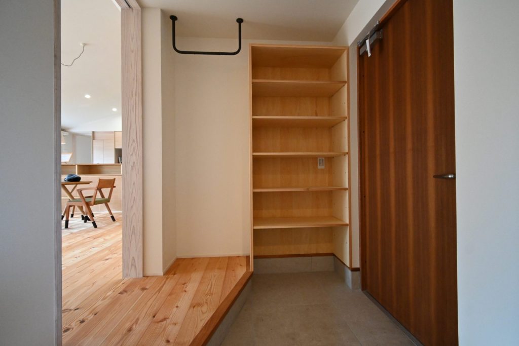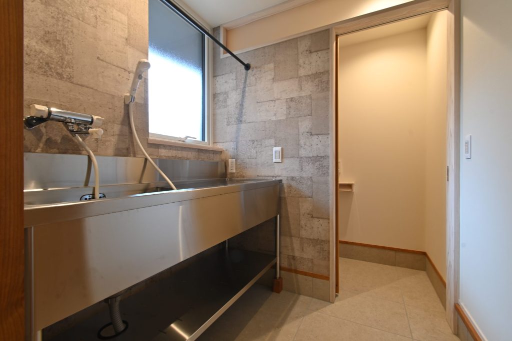 雨天でも屋外に出やすいよう軒を1.5mと深く取り、清掃性のよいタイルテラスを設けた。玄関土間には愛犬のお散歩後に足を洗える温水シャワー付きのシンクを備え、床は足ざわりのよい無垢カラマツ材、壁はひっかき傷や汚れを想定してビニルクロスと、アニマルフレンドリーな内装にしている。