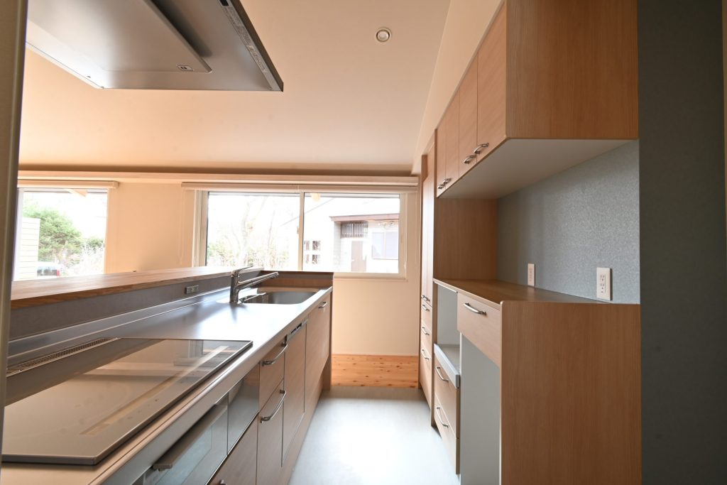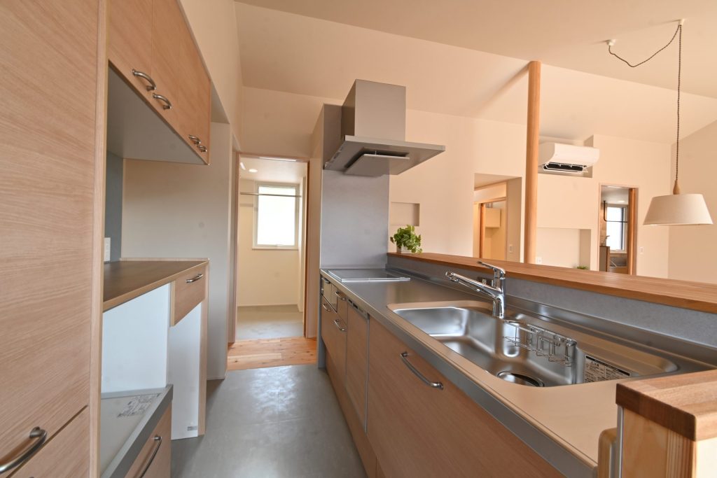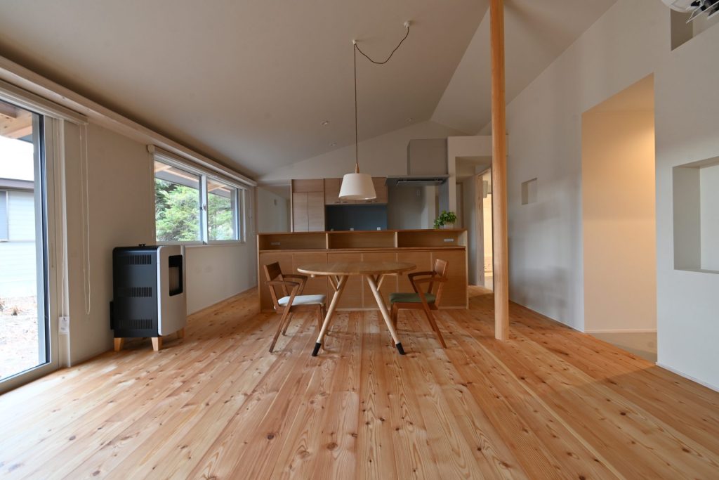 LDKは切妻屋根の形を生かした勾配天井によって、面積以上に広々と感じられる。料理中も家族や愛犬とのコミュニケーションがとれるように対面式のキッチンを採用。システムキッチンと造作のカウンター収納を組み合わせることで、室内に統一感を持たせている。