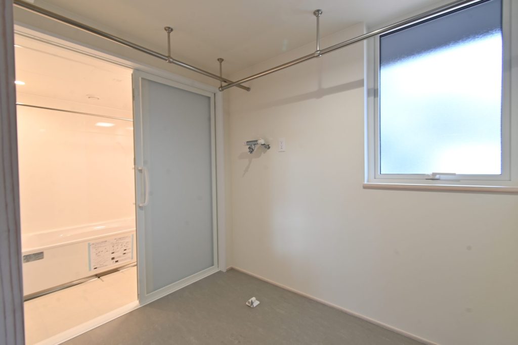 キッチン横のランドリーからウォークインクローゼット、洗面・トイレまで回遊できる動線をつくり、行き止まりをつくらない配置とした。